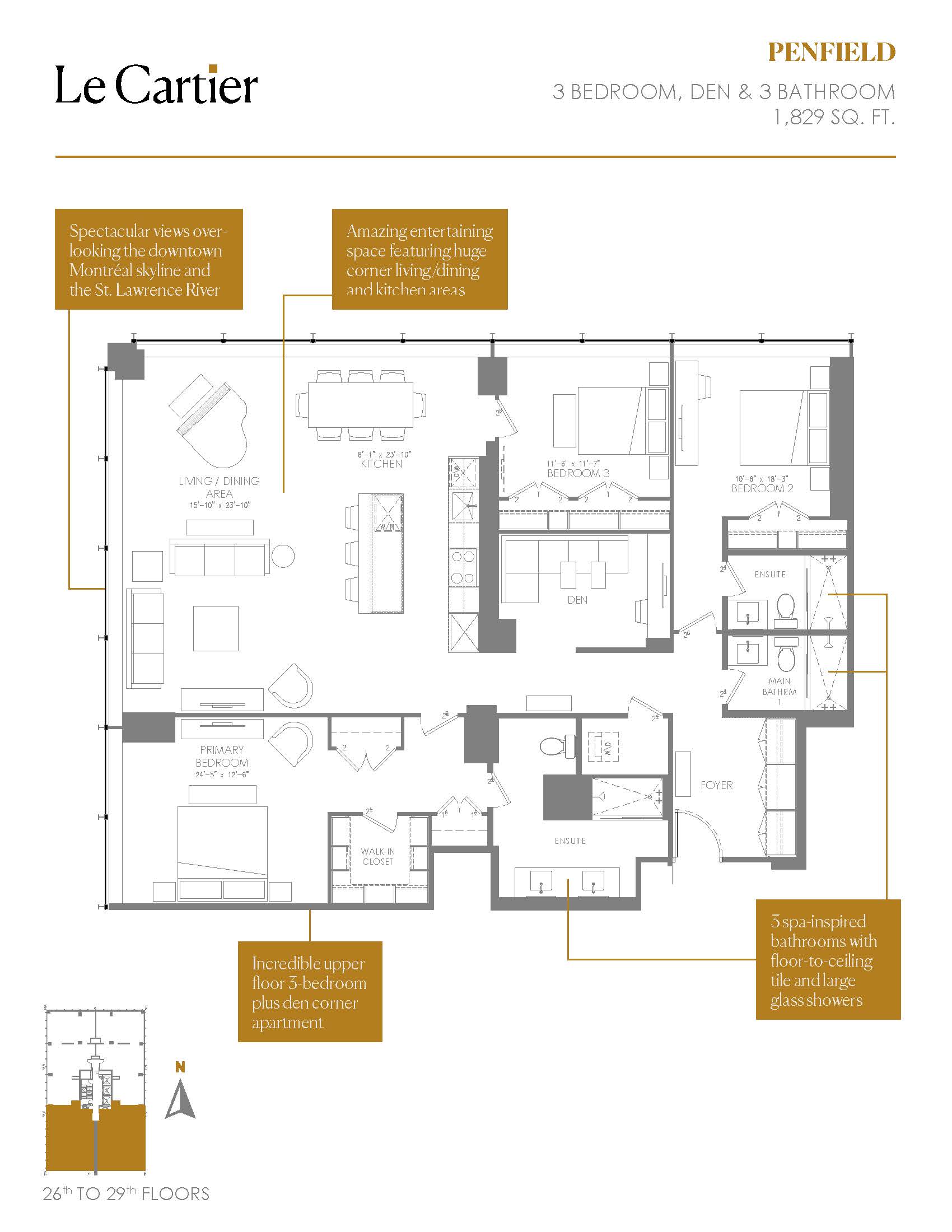 • Incredible upper floor 3-bedroom plus den corner apartment