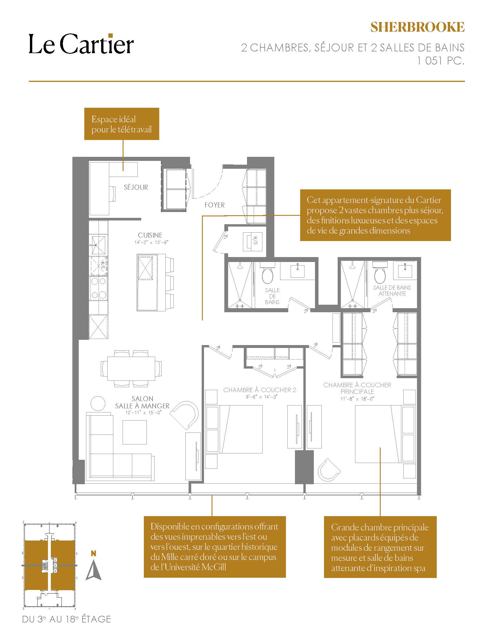 • Appartement-signature du Cartier, le Sherbrooke propose 2 vastes chambres plus séjour, des finitions luxueuses et des espaces de vie de grandes dimensions